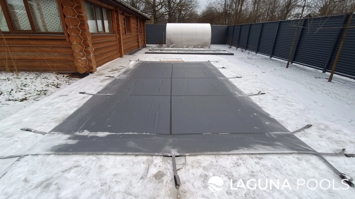 Композитный бассейн накрыт темно-серым тентом с натяжными ремнями, окружен снегом и деревянным домом.